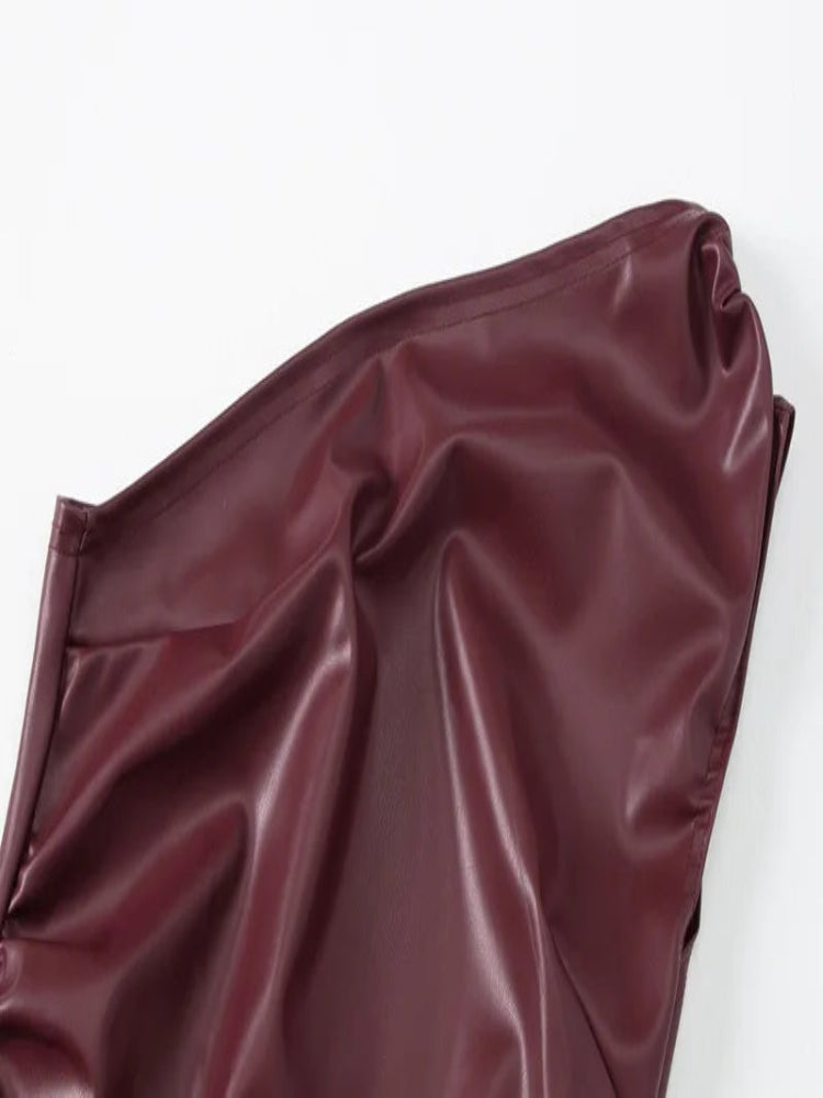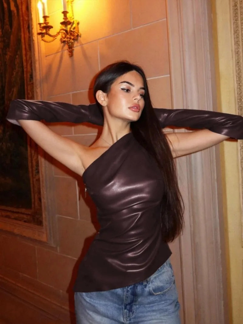Make a bold statement with this trendy asymmetrical PU tank top. Designed with a one-shoulder cut and sleek, solid PU material, this top combines edgy streetwear style with a modern, high-street fashion vibe. Its asymmetrical design adds a unique twist, making it perfect for parties, nights out, or casual chic looks.